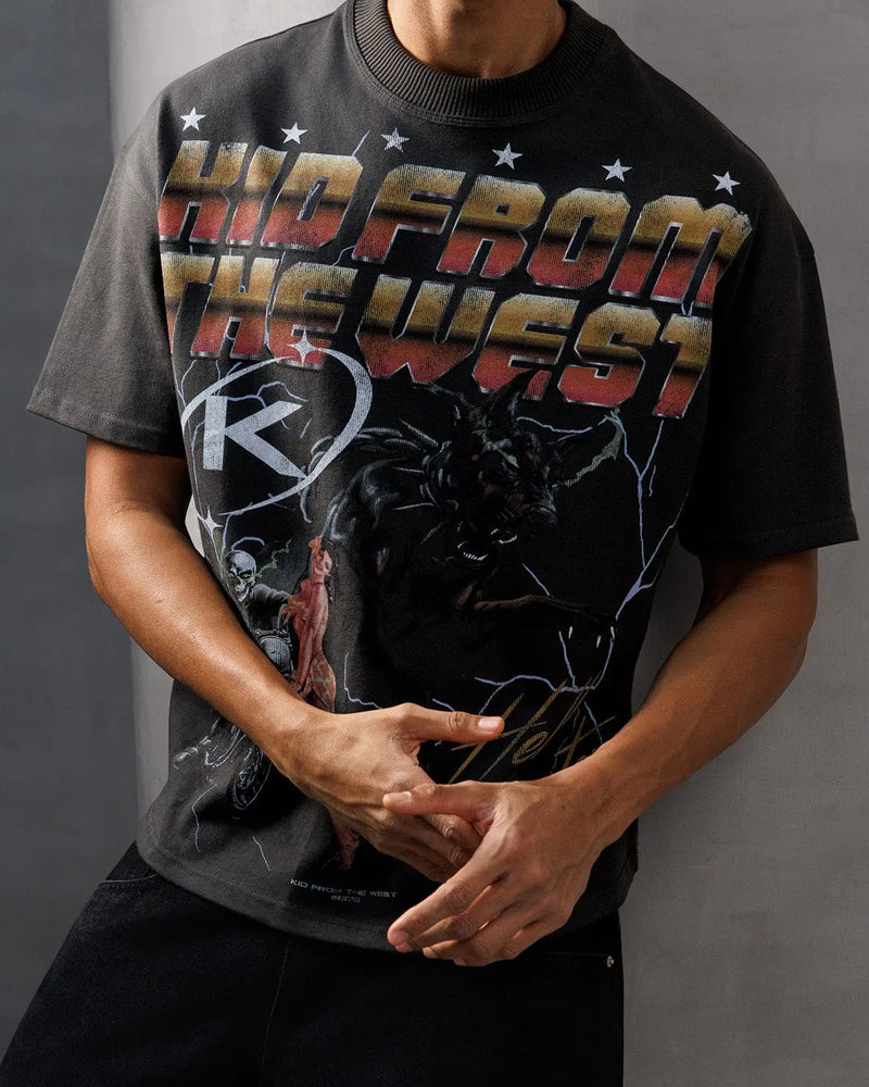 Vintage blackShort Sleeve T-Shirt with a slightly oversized fit, crafted from heavy weight cotton. The Hell Hunter Love T-Shirt features a ribbed crewneck collar, and our Hell Hunter graphic to the front and back. Vintage Black Graphic T-Shirt Round Neck Short Sleeves Oversized fit Composition:... -