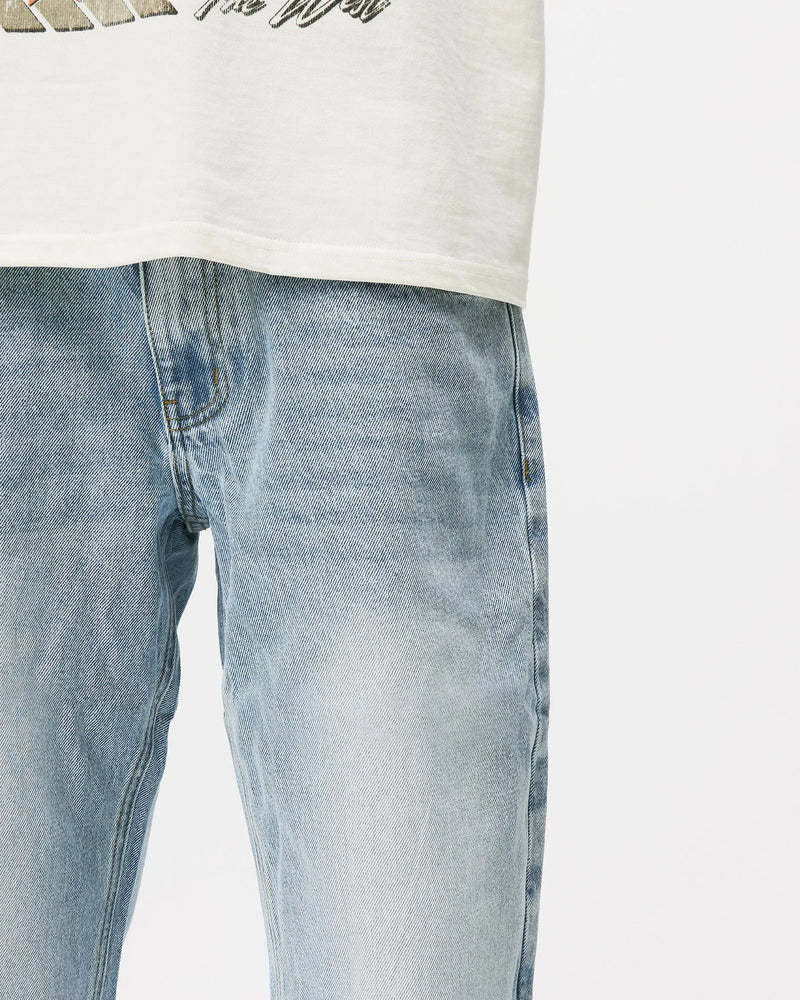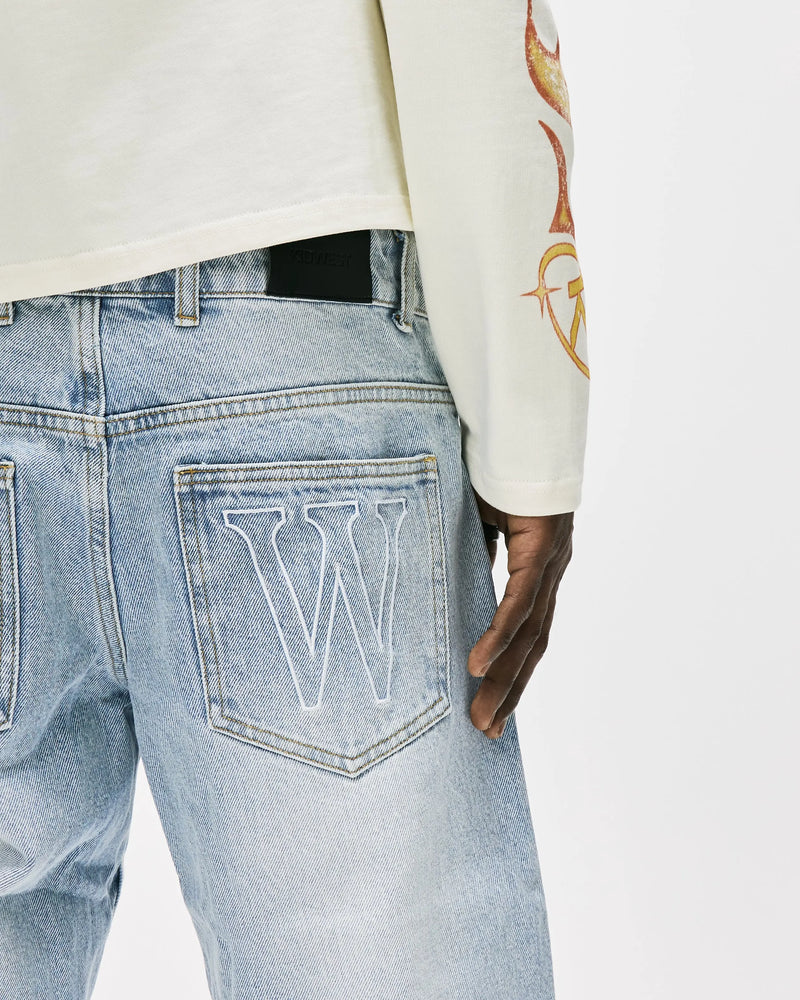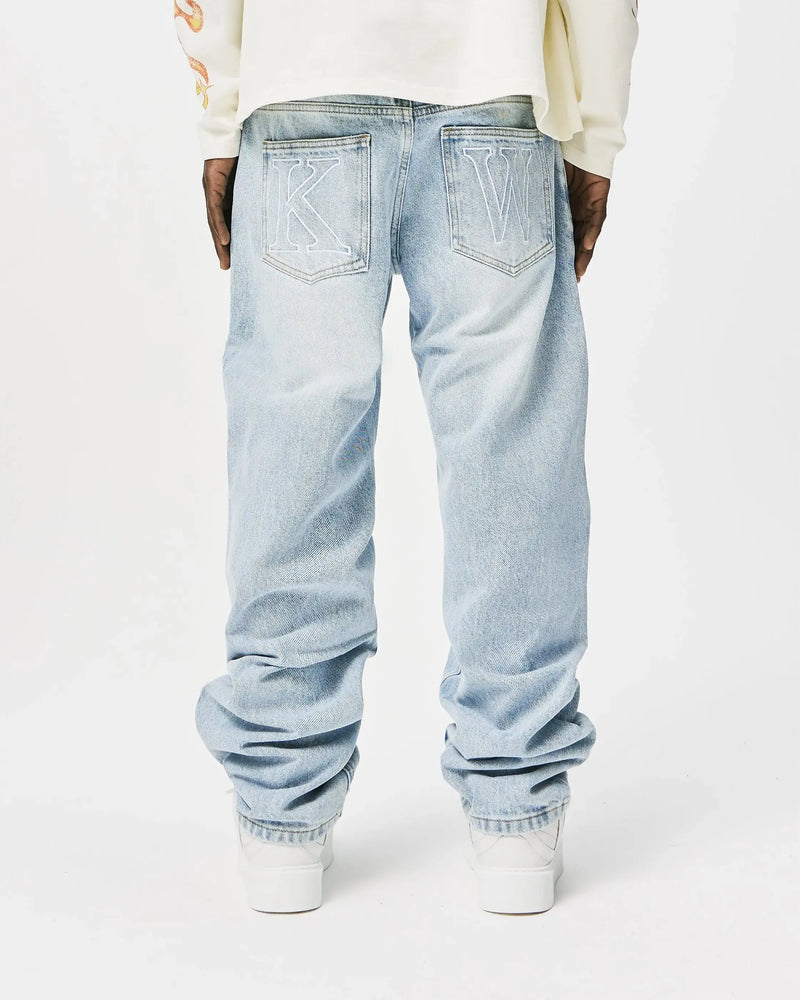 Blue creamColour: Blue Cream Details: - Straight leg relaxed fit - Rigid heavyweight denim - Embroidery KW Back pockets - Zip front fly fastening - Branded PU leather patch to back - Model wears size 34R and is 5'11, Chest: 38", Waist 34" Fabric Composition: 100% Cotton...