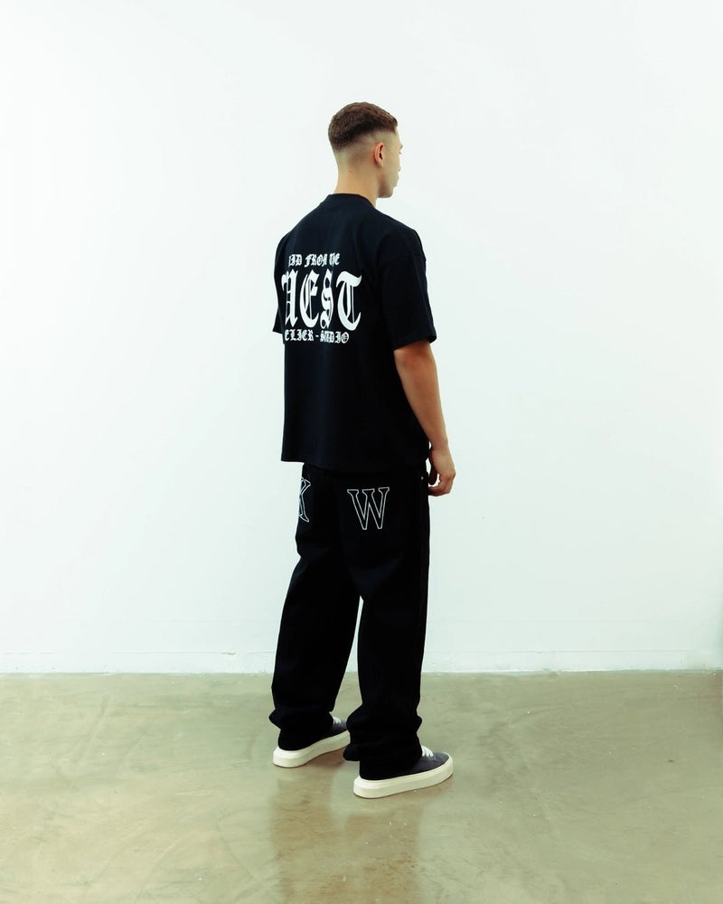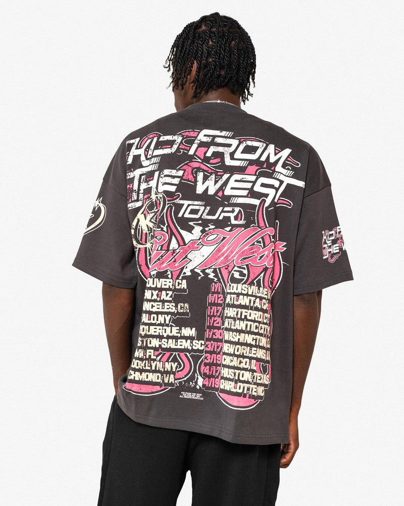 CharcoalOur T-shirts are made of heavy-weight cotton jersey. A ribbed crew neck collar and the Worldwide graphic decorate the garment. Soft-shrunk, preshrunk and with our Kid From The West neck label. Artwork on the front The model is 5'10ft (177.8cm) and wears Size Medium Crafted from 340GSM... -