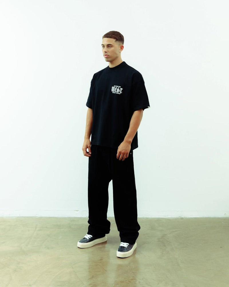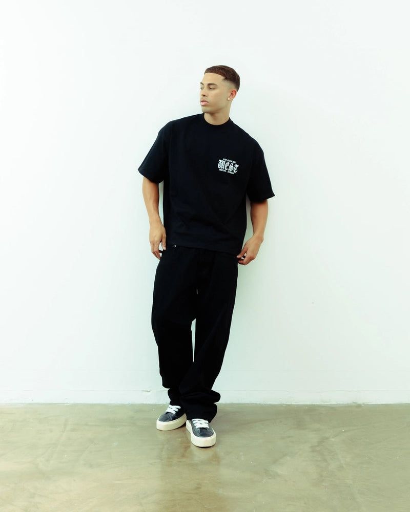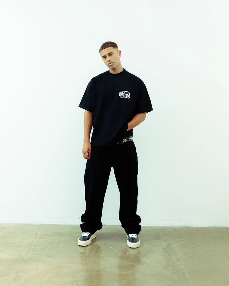 BlackOur T-shirt's are made of heavy-weight cotton jersey. A ribbed crew neck collar and the Larvotto graphic decorate the garment. Soft-shrunk, preshrunk and with our Kid From The West neck label. Artwork on the front The model is 5'10ft (177.8cm) and wears Size Medium Crafted from 340GSM... -
