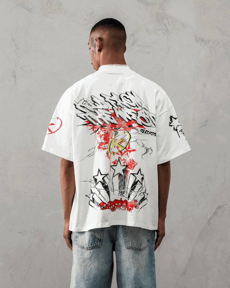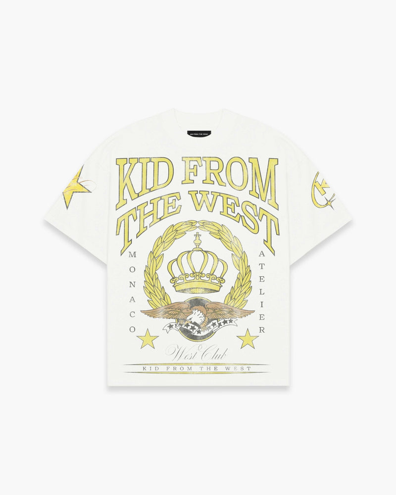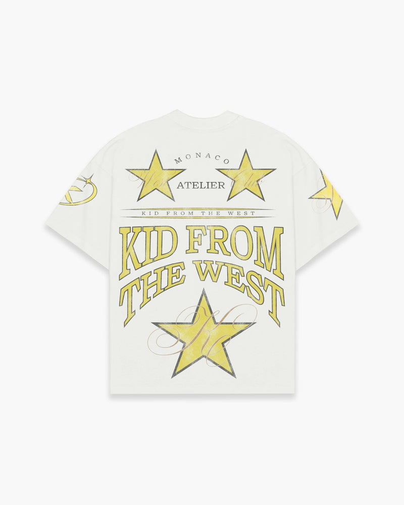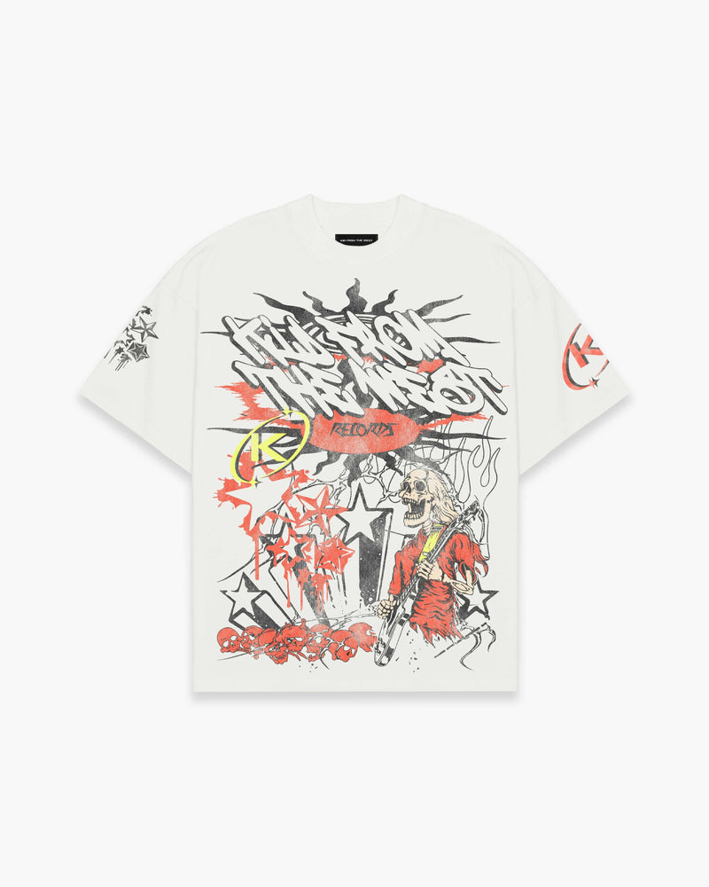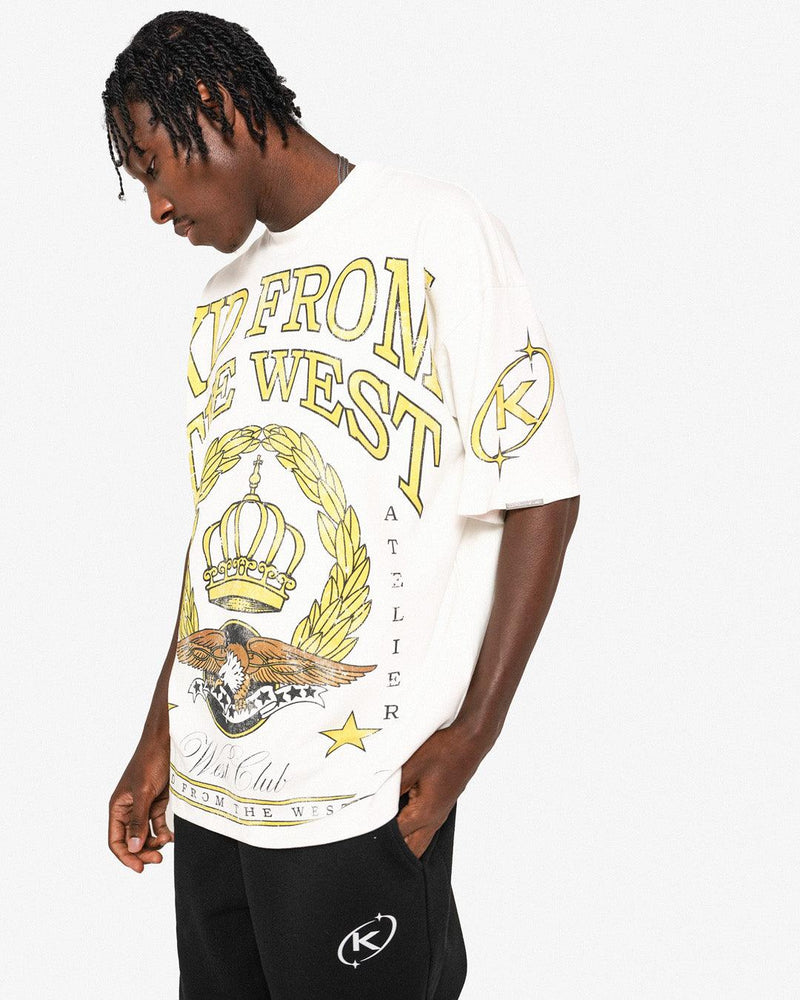 Ivory whiteOur T-shirt is made of heavy-weight cotton jersey. A ribbed crew neck collar and the KFTW Records graphic decorate the garment. Soft-shrunk, preshrunk and with our Kid From The West neck label. Artwork on the front The model is 5'10ft (177.8cm) and wears Size Medium... -