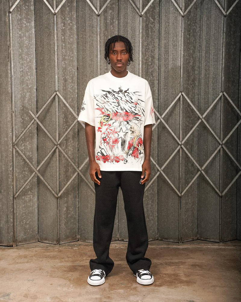 WhiteArtwork on the front The model is 5'10ft (177.8cm) and wears Size Medium Crafted from 340GSM 100% Organic Cotton Custom Milled Fabric Drop Shoulder Thick Collar Metal Sleeve Clamp Oversized Fit SIZE LENGTH SHOULDER CHEST SLEEVE XS 68cm 60cm 61.5cm 19cm S 70cm 62cm... -