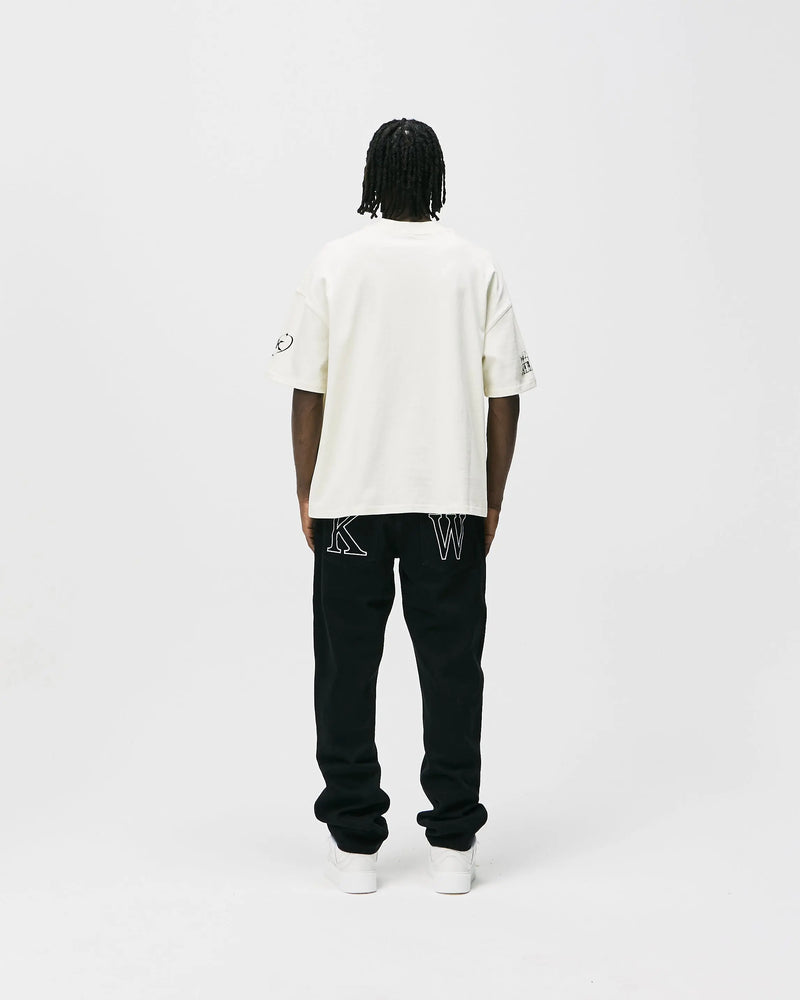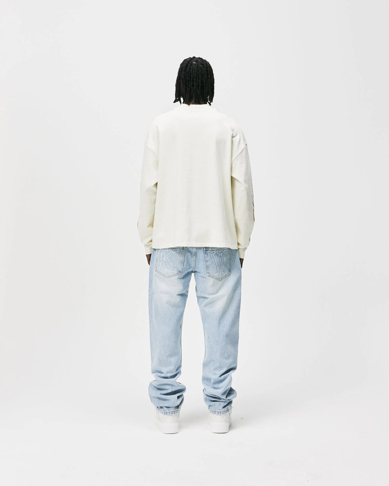 Blue creamColour: Blue Cream Details: - Straight leg relaxed fit - Rigid heavyweight denim - Embroidery KW Back pockets - Zip front fly fastening - Branded PU leather patch to back - Model wears size 34R and is 5'11, Chest: 38", Waist 34" Fabric Composition: 100% Cotton... -