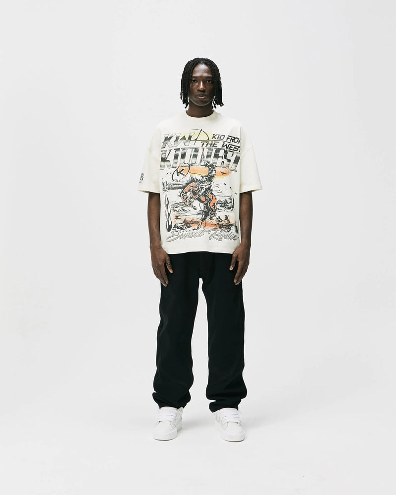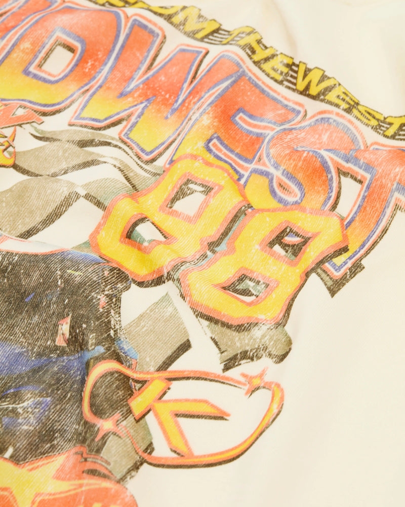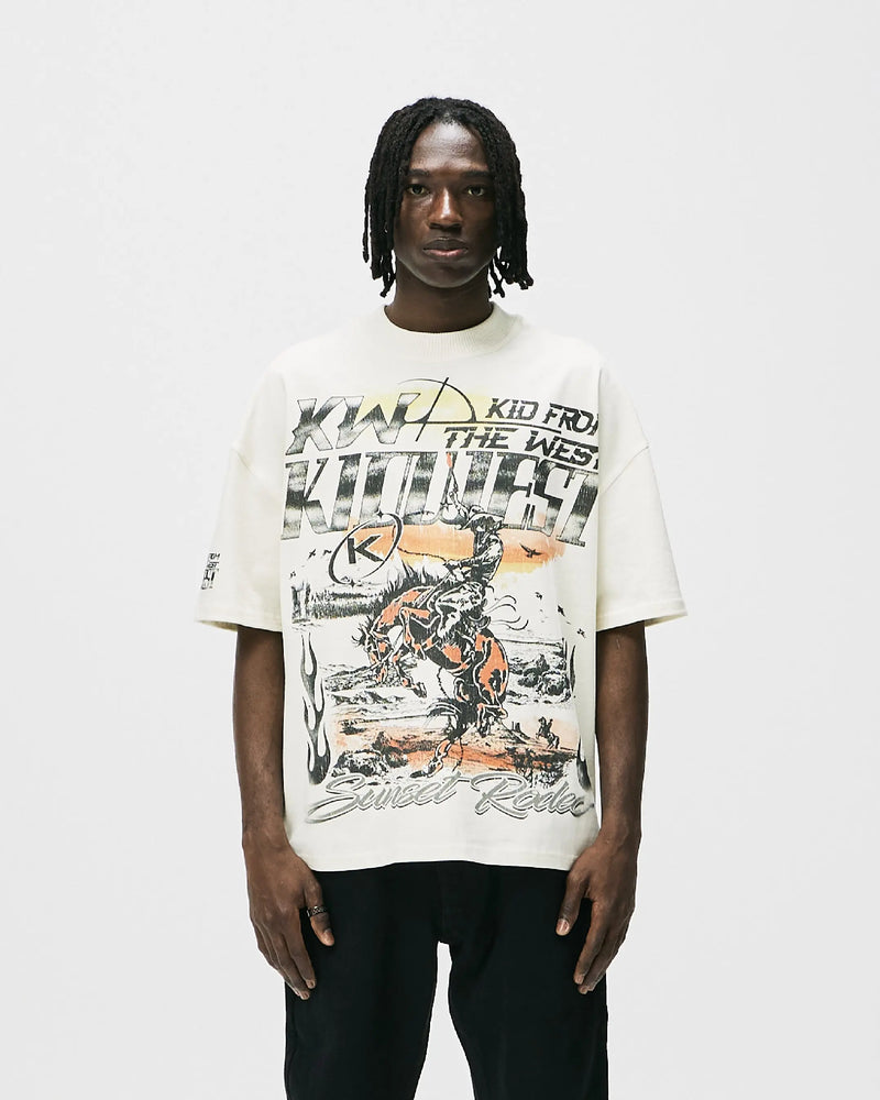 Vintage whiteShort Sleeve T-Shirt with a slightly oversized fit, crafted from heavy weight cotton. The Sunset Rodeo T-Shirt features a ribbed crewneck collar, and our Sunset Rodeo graphic to the front and sleeves. Vintage White Graphic T-Shirt Screen Printed Round Neck Short Sleeves Oversized fit... -