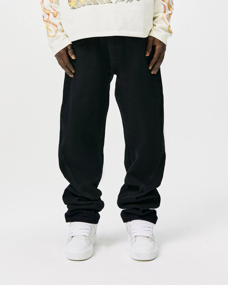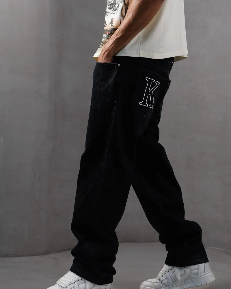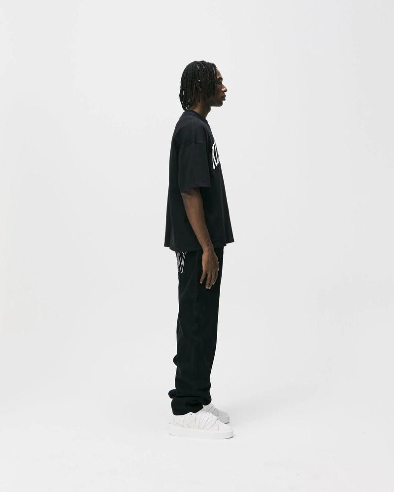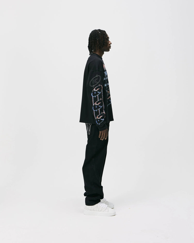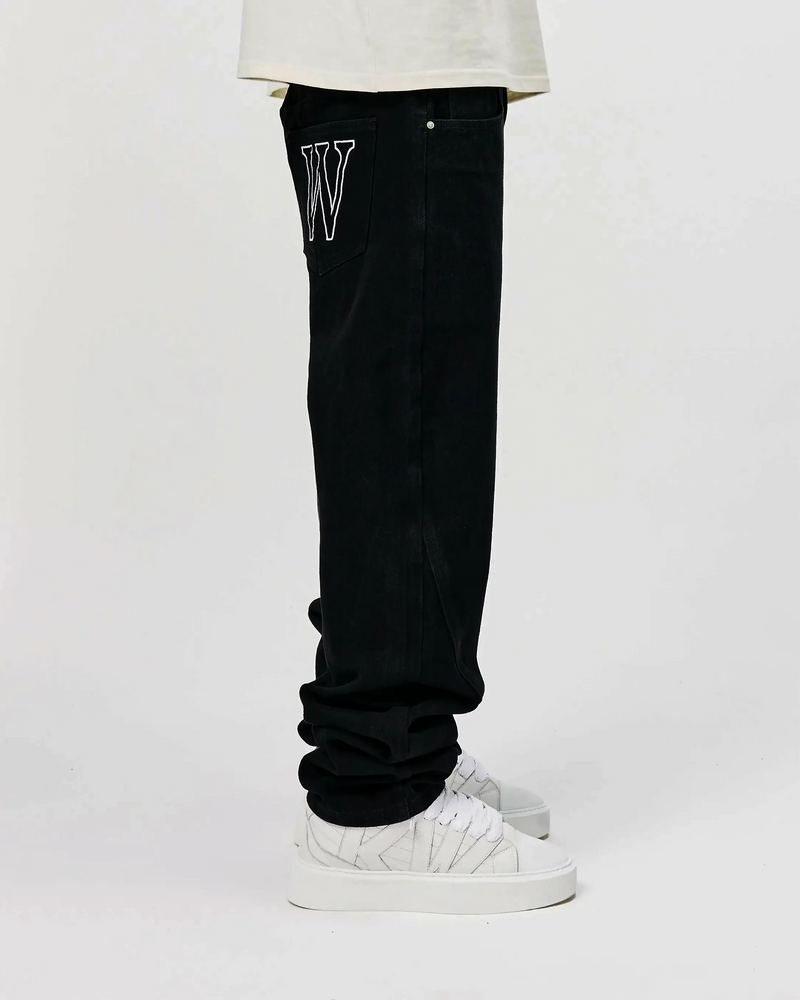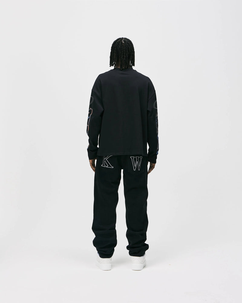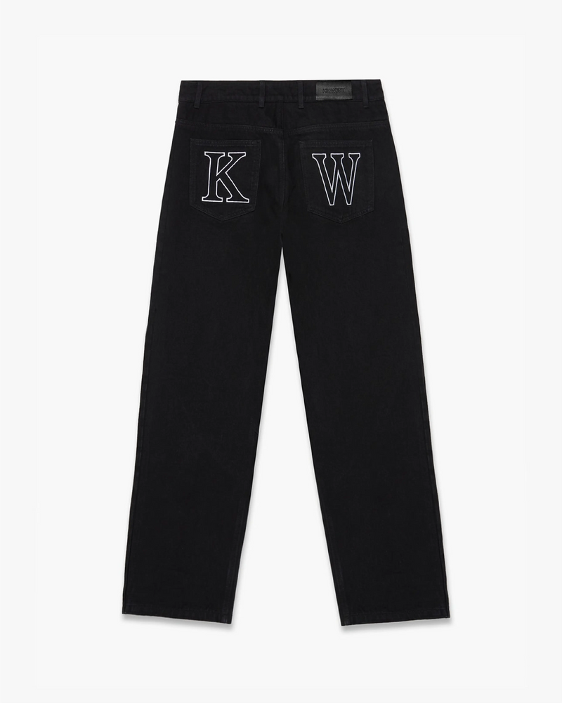 Jet blackColour: Black Details: - Straight leg relaxed fit - Rigid heavyweight denim - Embroidery KW Back pockets - Zip front fly fastening - Branded PU leather patch to back - Model wears size 34R and is 5'11, Chest: 38", Waist 34" Fabric Composition: 100% Cotton ... -